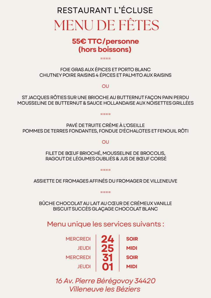 À l’occasion des fêtes, le Restaurant L’Écluse Béziers vous invite à vivre un moment d’exception autour d’un menu spécialement imaginé pour célébrer la magie de Noël. Une cuisine inspirée, délicate et pleine de sensibilité, où chaque plat raconte une histoire et réchauffe le cœur autant que le palais.