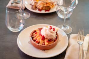 tarte au raisinet sorbet pêche de vigne de la maison Antolin